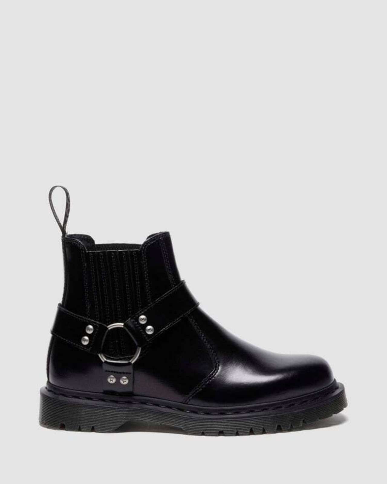 クラシックなシルエットに、ハーネスリングとスクリュースタッズをあしらい、辛口なアクセントで存在感のあるスタイルに仕上げたチェルシーブーツ。