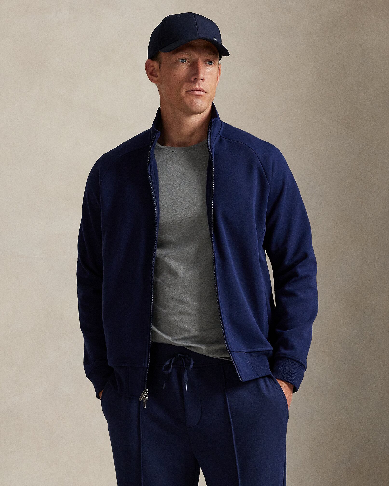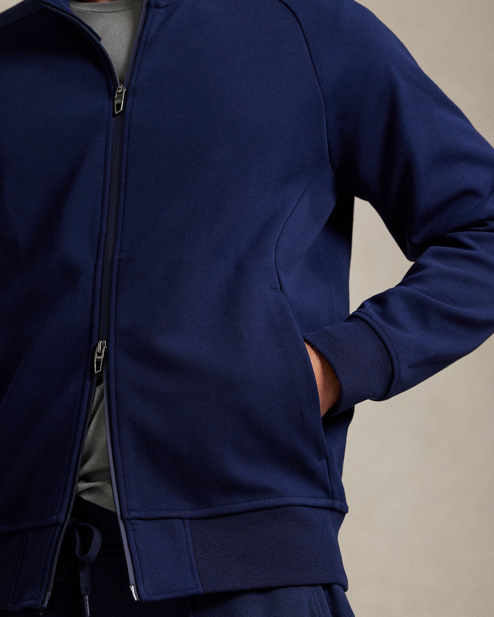 なめらかなダブルニット生地で仕立てたモックネックジャケット。