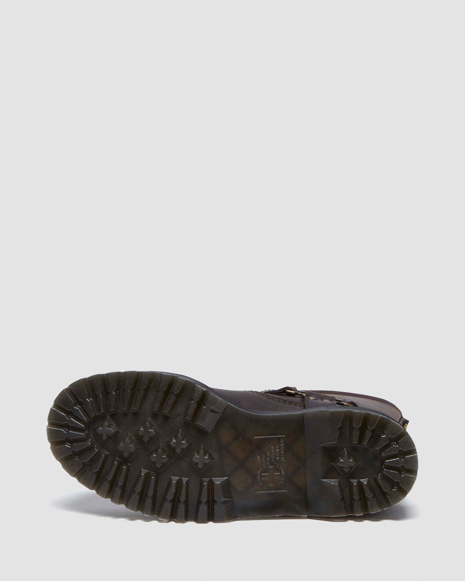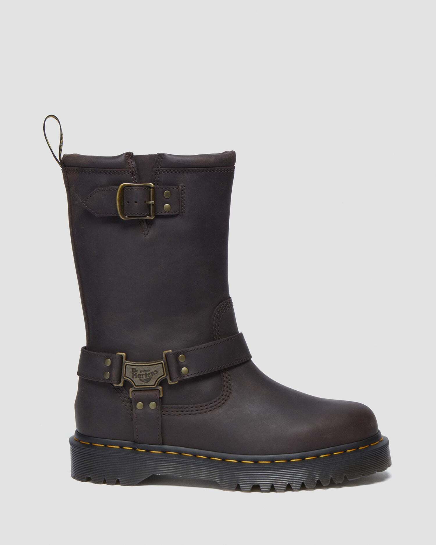 ミドル丈のプルアップブーツは、ブランドロゴ入りのメタルプレートとサイドベルトを配し、バイカーブーツらしいタフさに洗練を添えたデザイン。タウンユースはもちろん、ライブやフェスなどアクティブなシーンにもマッチします。アッパーにはラギッドでビンテージ風のプルアップレザーを使用。ボリュームのあるBEXソールを備え、イエローのウェルトステッチとアイコニックなヒールループで仕上げています。