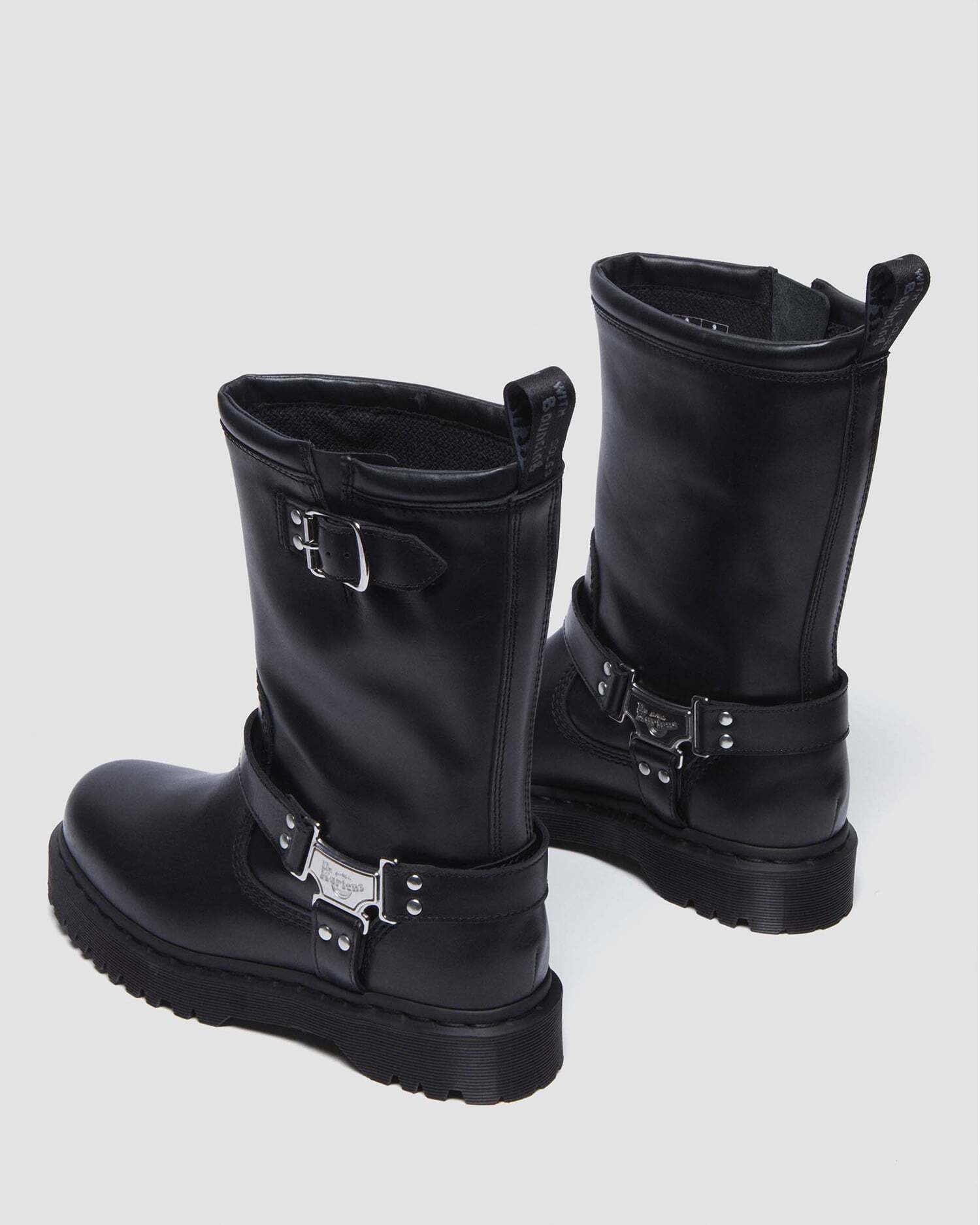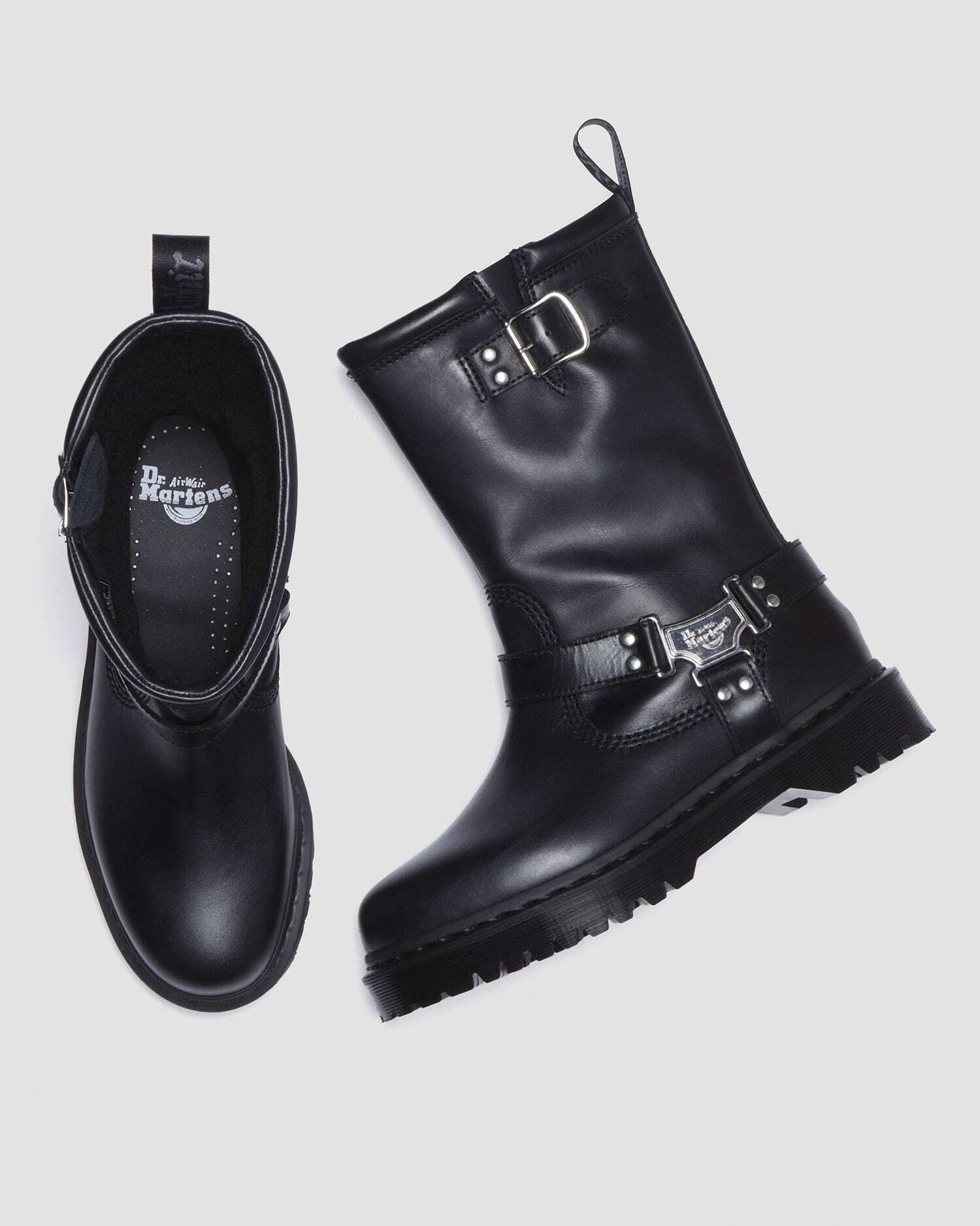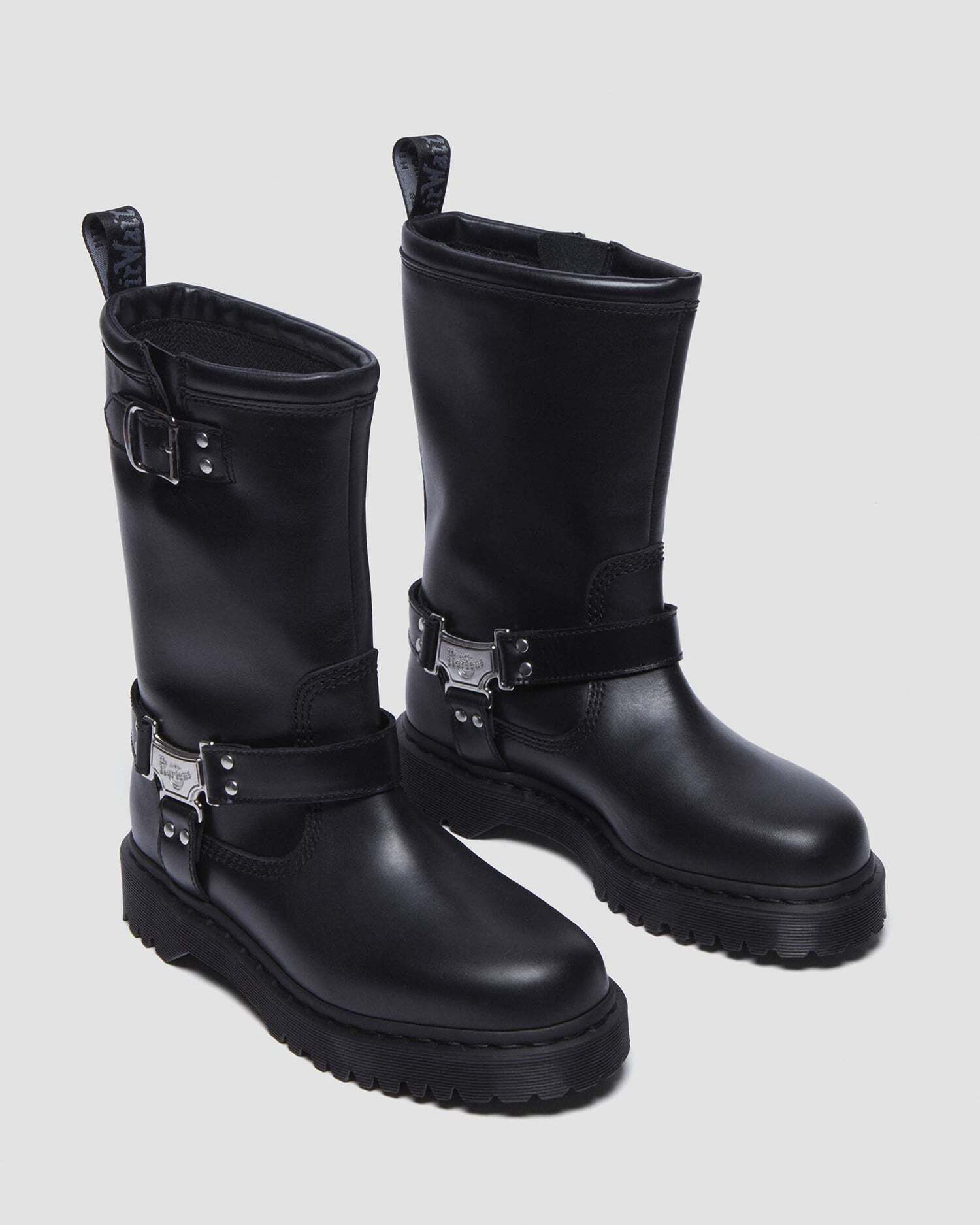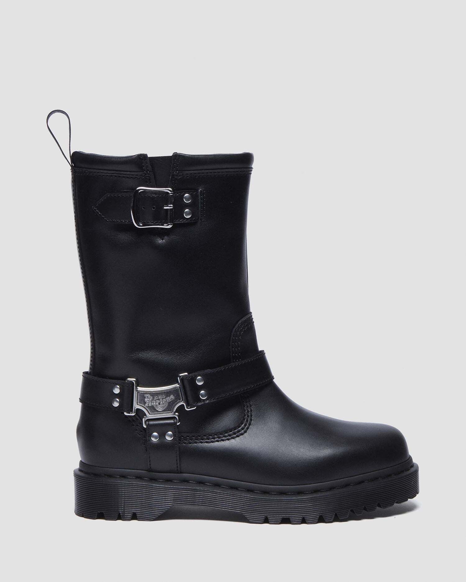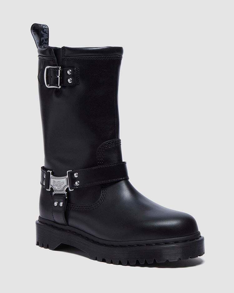 ミドル丈のプルアップブーツは、ブランドロゴ入りのメタルプレートとサイドベルトを配し、バイカーブーツらしいタフさに洗練を添えたデザイン。タウンユースはもちろん、ライブやフェスなどアクティブなシーンにもマッチします。アッパーにはサテン調の光沢を持つ頑丈なワナマレザーを使用。ボリュームのあるBEXソールを備え、ブラックのウェルトステッチとアッパーに馴染むカラーのヒールループで仕上げています。