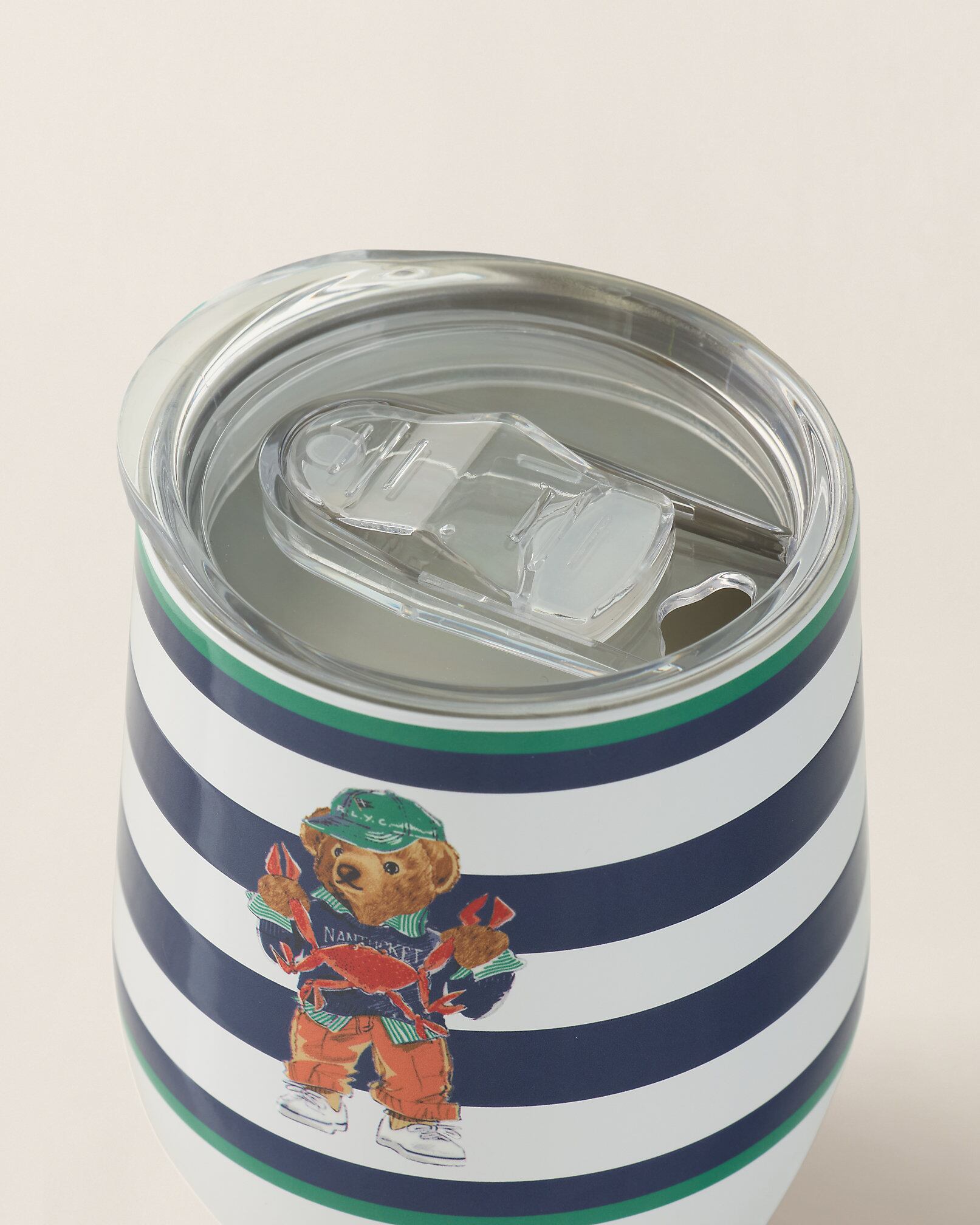 "Nantucket"のグラフィックセーターを身に着けて陽気な赤いカニを手にした遊び心たっぷりのPoloベアをあしらい、ノーティカルな魅力をプラスしたステンレススティール製タンブラー。