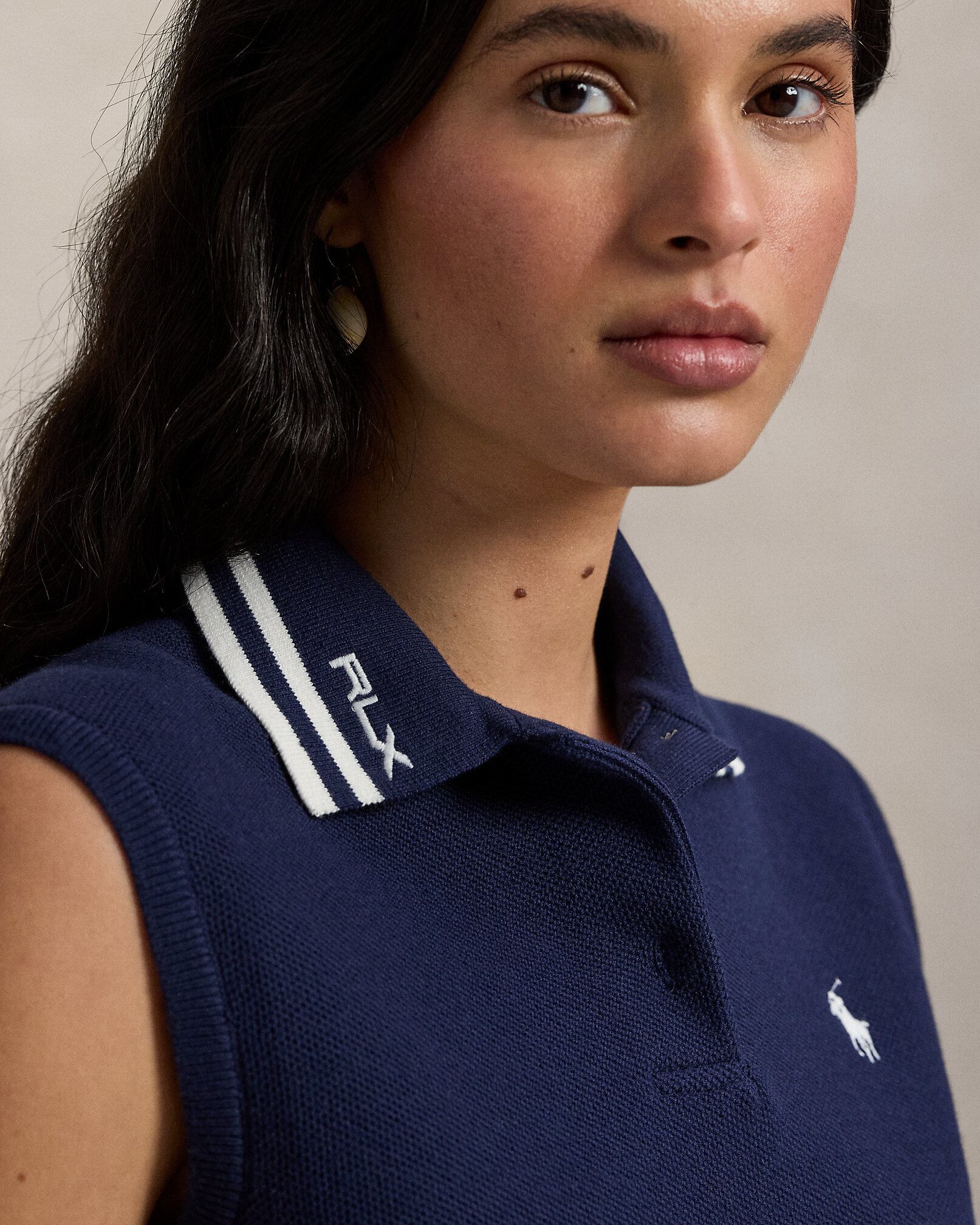 クールでドライ、快適な着心地をキープする、COOLMAX®繊維を使用した薄手のコットン混紡ポロカラーセーター。右襟にあしらった"RLX"ロゴの刺繍でアクセントをプラスした、リラックスフィットのシルエット。
